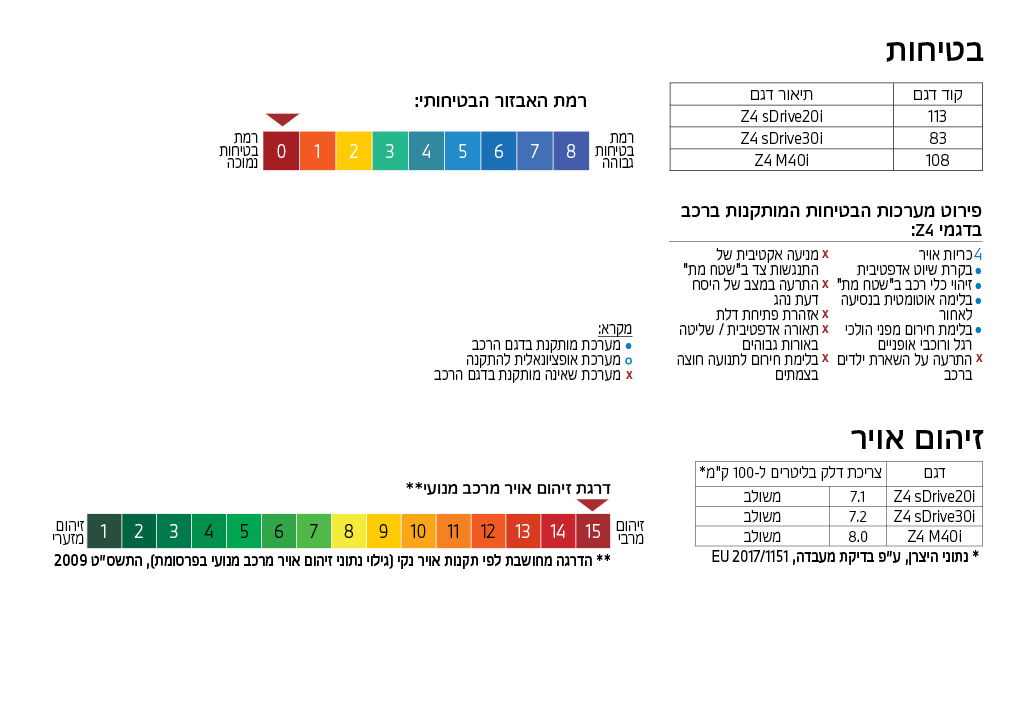 ב.מ.וו Z4 היא מכונית רודסטר קטנה וספורטיבית. ה-Z4 מתחרה ברכבים כמו אודי TT וניסאן 370Z וגם בפורשה בוקסטר. העיצוב המרשים נותר נאמן לרכב הקונספט ולעומת הדור הקודם שעשה שימוש בגג מתקפל קשיח, הדור השלישי והנוכחי חזר לגג הבד המסורתי. לב.מ.וו Z4 מנוע בנזין בנפח 2.0 ליטרים בשני הספקים: 197 ו-258 כ"ס. אם תרצו לקבל מה-Z4 שלכם קצת יותר – לגרסת M40i מנוע 3.0 ליטרים 6 צילינדרים בטור המספק 340 כ"ס. התנהגות הכביש מהנה במיוחד הודות לחלוקת משקל מוצלחת ומשקל עצמי נמוך, ובמפתיע גרסאות ה-2.0 ליטרים מרגישות קלילות ומהנות יותר לנהיגה. ה-Z4 מספקת תחושת יוקרה ואיכות חומרים גבוהה. נציין גם כי ב.מ.וו Z4 חולקת פלטפורמה עם לא אחרת מאשר טויוטה סופרה בדור החמישי שלה. בשורה התחתונה: ב.מ.וו Z4 היא מכונית ספורטיבית קטנה שמספקת חווית נהיגה מהנה